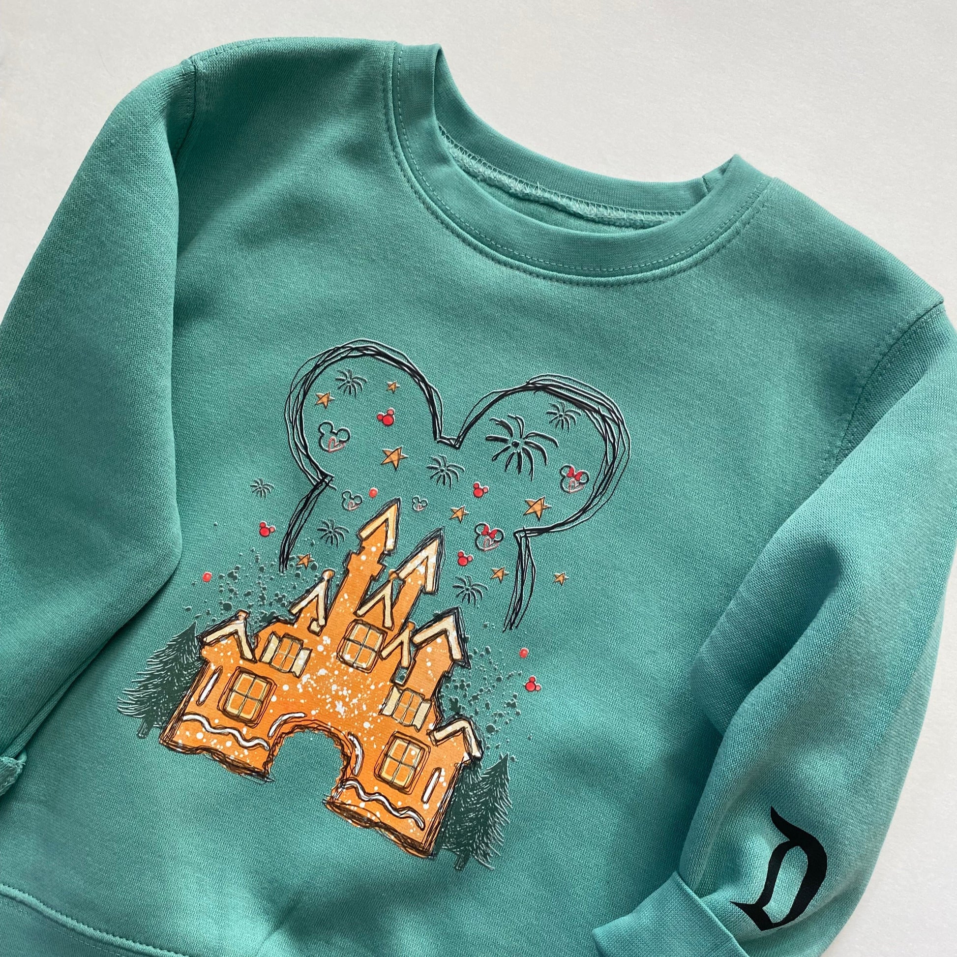 Stay warm and trendy with this must have for the chilly season. Whether you're exploring the outdoors or relaxing at school, this sweater has you covered! Your little one will adore the Disney gingerbread castle design.